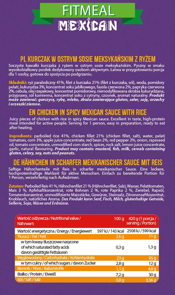 A FitMeal Mexican a folyékony táplálékkiegészítők piacának vezető márkájának terméke, amely magas fehérjetartalmú, azonnal fogyasztható ételeket kínál. A gyors fehérjék tartalma a finom mexikói fűszerekkel kombinálva nemcsak táplálóvá, hanem rendkívül ízletessé is teszi ezt az ételt. A magas fehérjetartalom támogatja az izomtömeget és felgyorsítja az edzés utáni regenerálódást, ami tudományosan bizonyított. A termék ideális azok számára, akik aktív életmódot folytatnak, és gyors és egyszerű étkezési módot keresnek a minőség feláldozása nélkül.