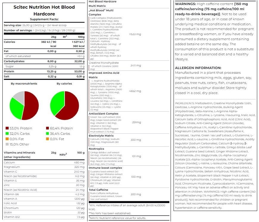 SCITEC A Hot Blood Hardcore egy hatékony edzés előtti kiegészítő, amely formulájában számos, a bedurranás, az állóképesség és az energia fokozására tervezett leghatékonyabb összetevőt ötvöz. A formula kreatint tartalmaz, amely az izomsejtek energiatermelésének kulcsfontosságú összetevője, valamint aminosavakat, például arginint és taurint, amelyek fontos szerepet játszanak a nitrogén-monoxid termelésében és az optimális nitrogénegyensúly fenntartásában intenzív edzés során.