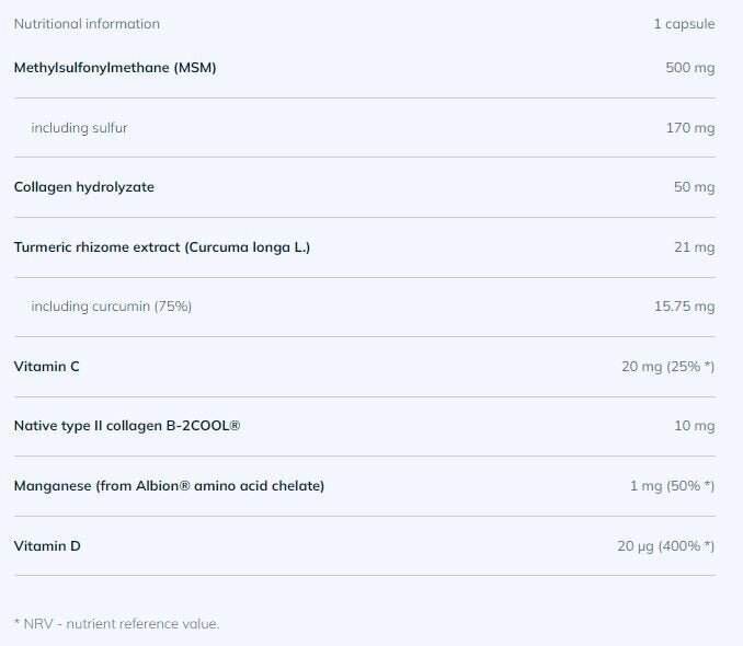 Hozzávalók: metilszulfonil-metán (MSM), töltőanyag – mikrokristályos cellulóz, kollagén-hidrolizátum, kurkuma rizóma kivonat (Curcuma longa L.), L-aszkorbinsav – C-vitamin, csomósodást gátló anyagok – zsírsavak magnéziumsói, natív II-es típusú kollagén B-2COOL®, kolekalciferol – D-vitamin, mangán-biszglicinát (Albion® aminosav-kelát) – mangán, kapszula (zselatin kapszula, színezék: E 171)