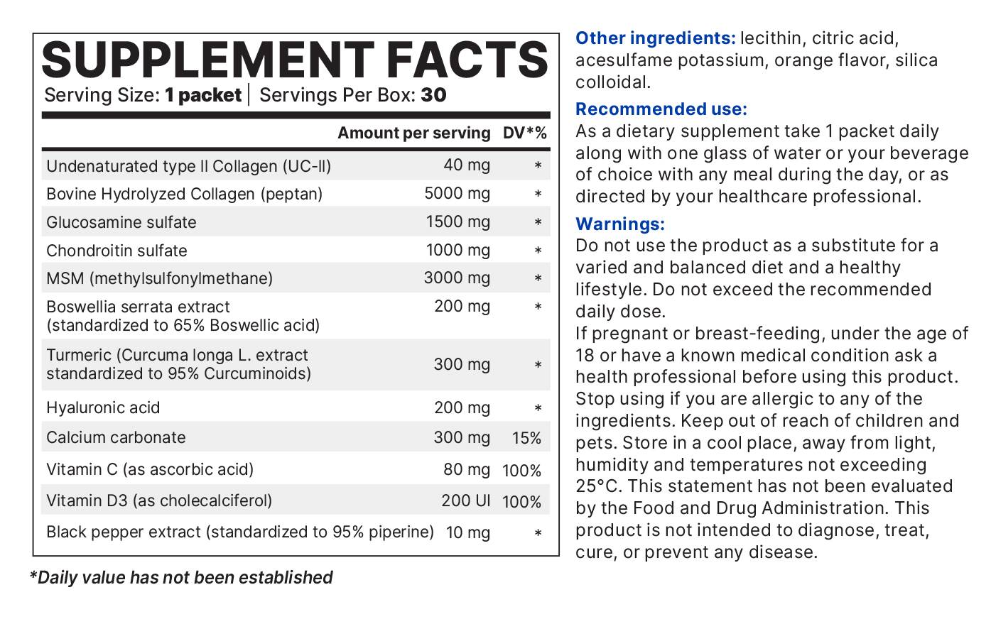 • ✔ Tartalmaz II-es típusú denaturálatlan kollagént (UC-II), hidrolizált marha kollagént, glükózamint, kondroitint és MSM-et az optimális ízületi egészségért.