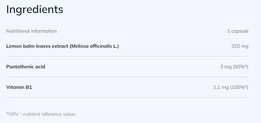 Hozzávalók: citromfű levélkivonat (Melissa officinalis L.), töltőanyag – mikrokristályos cellulóz; csomósodást gátló anyagok – zsírsavak magnéziumsói, szilícium-dioxid; kalcium-pantotenát – pantoténsav, tiamin-hidroklorid – B1-vitamin, kapszula (héjkomponens – zselatin, ételszínezék – E 171)