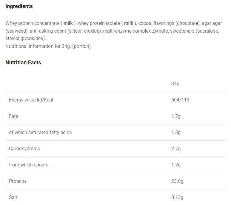 Tejsavófehérje-koncentrátum ( tej ), tejsavófehérje-izolátum ( tej ), agar-agar (tengeri moszat), csomósodást gátló anyag (szilícium-dioxid), aromák (vanília), Zymate multienzim komplex, édesítőszerek (szukralóz, szteviol glikozidok), színezékek (béta-karotin).