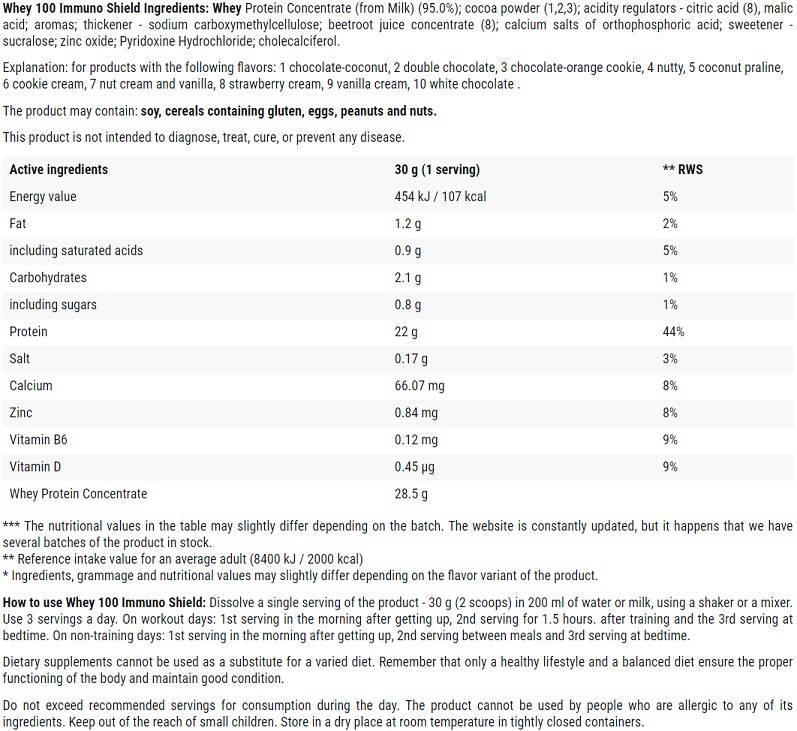 Tartalmának 100%-a tejsavófehérje-koncentrátum, amelynek tisztasága meghaladja a 80%-ot. A tejsavófehérje a legnépszerűbb és leghatékonyabb természetes eredetű fehérjék közé tartozik. Magas biológiai értékkel (BV104), nagyon jó oldhatósággal és felszívódással, valamint jelentős mennyiségű elágazó láncú aminosavval (BCAA) és glutaminnal rendelkezik.