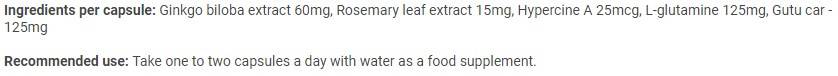 A készítményhez hozzáadott rozmaring zsírban oldódó antioxidánsairól ismert, amelyek segítenek semlegesíteni a szervezetben lévő szabad gyököket. Ez kiváló szövetségessé teszi az agyműködés javításában. A ginkgo biloba kivonat javítja a vérkeringést az agyszövetben, ami jobb oxigén- és tápanyagellátást eredményez a sejtekben. Ezenkívül a gotu kola segít javítani az agy vérkeringését, ami elengedhetetlen a memóriához és a koncentrációhoz.