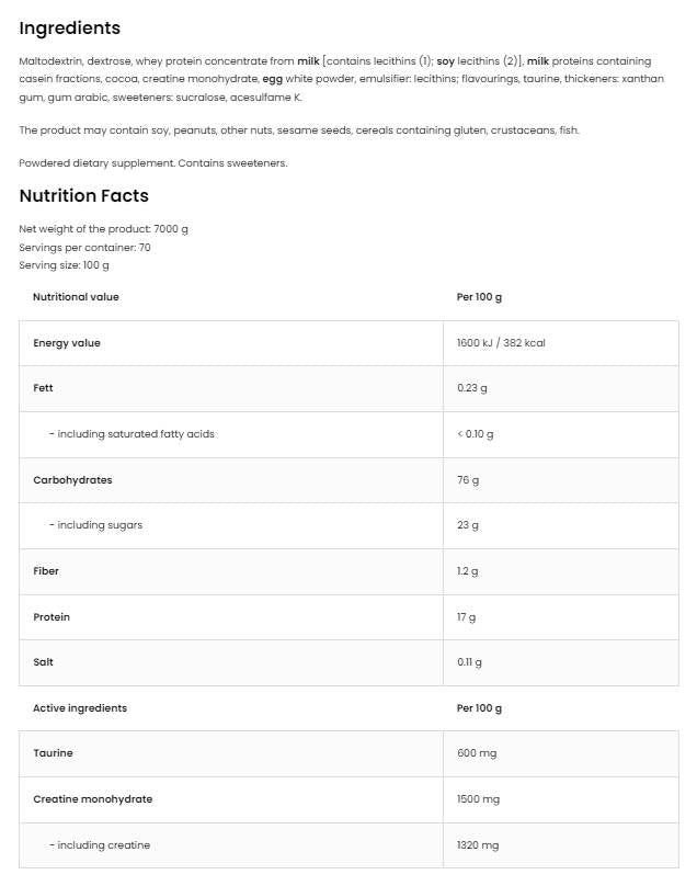 Anabolikus tömegnövelő | Tömegnövelő kreatinnal és taurinnal 7000 gramm