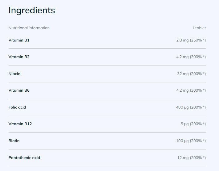 Hozzávalók: töltőanyagok – mikrokristályos cellulóz, térhálósított nátrium-karboxi-metil-cellulóz; nikotinamid – niacin, laktóz, kalcium-D-pantotenát – pantoténsav, képzőanyag – kalcium-foszfát; piridoxin-hidroklorid – B6-vitamin, cianokobalamin – B12-vitamin, riboflavin – B2-vitamin, tiamin-mononitrát – B1-vitamin, csomósodást gátló anyag – magnézium-sztearát; pteroilmonoglutaminsav – folsav, D-biotin, fényezőanyagok – polivinil-alkohol, polietilénglikol, talkum, kálium-alumínium-szilikát, polioxietilén-szorbitán-monooleát; színezékek – titán-dioxid, vas-oxid