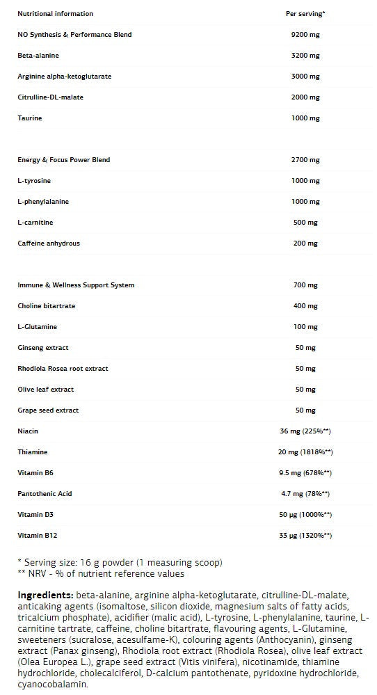 Ez az edzés előtti ital olyan összetevők komplexét tartalmazza, amelyek stimulálják a testet, mint például a vízmentes koffein és a taurin. Ezek minden bizonnyal serkentik az adrenalin felszabadulását, ami mozgósítja a rendszer energiapályáit, hogy több edzést lehessen végezni. A fő összetevői a...