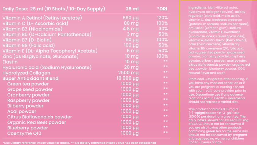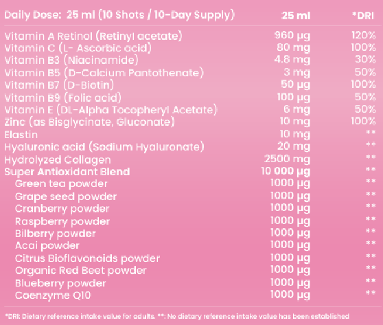 Teljes összetétel : Többszörösen szűrt víz, hidrolizált kollagén (szarvasmarha), savanyúságot szabályozó anyag (citromsav, almasav), C-vitamin, frissességtartó szer (kálium-szorbát, nátrium-benzoát), cink, emulgeálószer (xantángumi), nátrium-hialuronát, E-vitamin, édesítőszer (szteviol glikozidok, szukralóz, ace K), A-vitamin, színezék (béta-karotin), aroma (áfonya aroma), B5-vitamin, koenzim Q10, biotin, zöld tea por, szőlőmag por, áfonya por, málna por, áfonya por, acai por, citrus bioflavonoid por, bio céklapor, áfonya por. 100%-ban természetes aroma és színezék.