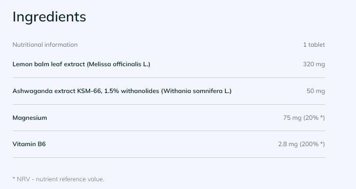 Hozzávalók: magnézium-malát, citromfű kivonat (Melissa officinalis l.); mikrokristályos cellulóz (töltőanyag); ashwagandha kivonat (Withania somnifera L.); polivinil-alkohol, polietilénglikol, talkum (fényezőanyagok); térhálós nátrium-karboximetil-cellulóz (töltőanyag); magnézium-sztearát, szilícium-dioxid (csomósodást gátló anyagok); piridoxin-hidroklorid (B6-vitamin); titán-dioxid, briljantkék FCF, vas-oxid (színezékek).