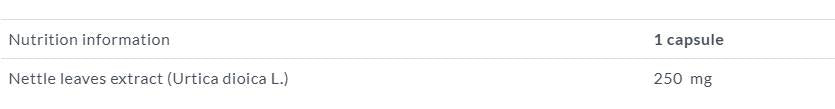 Hozzávalók: közönséges csalán (Urtica dioica L.) levelének kivonata, töltőanyag - mikrokristályos cellulóz; csomósodást gátló anyagok - zsírsavak magnéziumsói, szilícium-dioxid; kapszula (kapszula - zselatin, ételszínezék - E 171).