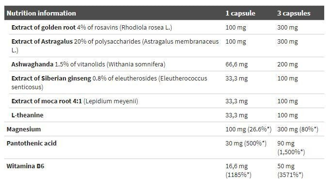 Hozzávalók: aranygyökér-kivonat, asztragalusz kivonat, ashwagandha kivonat, szibériai ginzeng kivonat, maca gyökérkivonat, L-teanin, magnézium-oxid, kalcium-D-pantotenát - pantoténsav, piridoxin-hidroklorid (B6-vitamin), mikrokristályos töltőanyag, cellulóz, magnézium-sztearát - csomósodást gátló anyag, kapszula (zselatin - bevonat, színezék: E171)