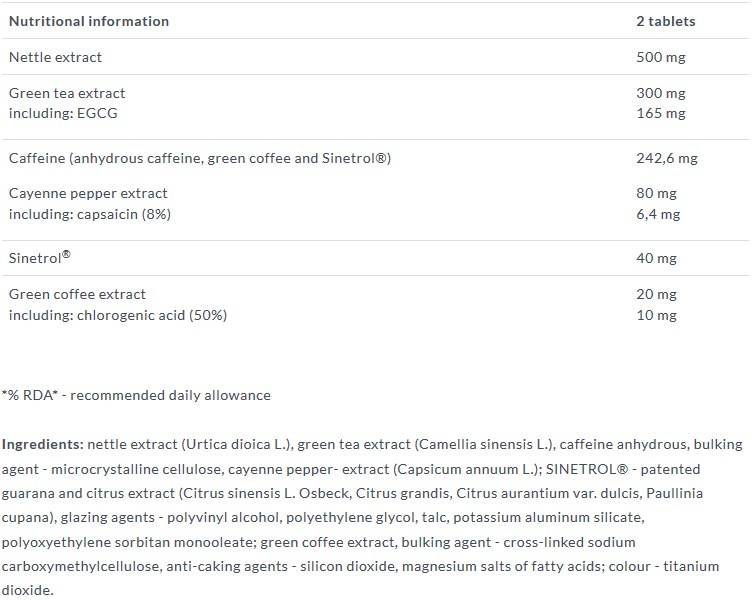 Hozzávalók: csalánkivonat (Ultra-nettle L.), zöld tea kivonat (Camellia Sinensis L.), vízmentes koffein, töltőanyag - mikrokristályos cellulóz, erős paprika kivonat (Pepper L.); SINETROL® - szabadalmaztatott guarana és citrus kivonatok (Citrus Sinensis L. Osbeck, Citrus Grandis, Citrus Aurantium Var. Oil, Paullinia cupana.), fényezőanyagok - polivinil-alkohol, polietilénglikol, talkum, kálium-alumínium-szilikát, polioxietilén-szorbitán-monooleát; zöld kávé kivonat, töltőanyag - térhálósított nátrium-karboximetil-cellulóz, csomósodást gátló anyagok - szilícium-dioxid, zsírsavak magnéziumsói; színezék - titán-dioxid.