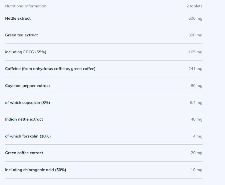 Hozzávalók: csalánkivonat (Urtica dioica L.), zöld tea kivonat (Camellia sinensis L.), vízmentes koffein, töltőanyag – mikrokristályos cellulóz, chili paprika kivonat (Capsicum annuum L.); SINETROL® – szabadalmaztatott guarana és citrusfélék kivonata (Citrus sinensis L. Osbeck, Citrus grandis, Citrus aurantium var. dulcis, Paullinia cupana), fényezőanyagok – polivinil-alkohol, polietilénglikol, talkum, kálium-alumínium-szilikát, polioxietilén-szobitán; zöld kávé kivonat, töltőanyag – térhálósított nátrium-karboximetil-cellulóz, csomósodást gátló anyagok – szilícium-dioxid, zsírsavak magnéziumsói; színezék – titán-dioxid