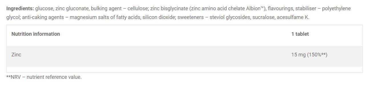 Hozzávalók: glükóz, cink-glükonát, töltőanyag – cellulóz; cink-biszglicinát (Albion™ cink-aminosav-kelát), aromák, stabilizátor – polietilénglikol; csomósodást gátló anyagok – zsírsavak magnéziumsói, szilícium-dioxid; édesítőszerek – szteviol glikozidok, szukralóz, aceszulfám K