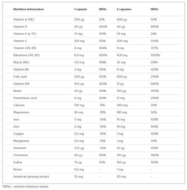Hozzávalók: kalcium-karbonát, magnézium-oxid, L-aszkorbinsav - C-vitamin, töltőanyag - cellulóz; DL-alfa-tokoferil-acetát - E-vitamin, cink-glükonát, amerikai ginzeng gyökérkivonat (Panax quinquefolius L.), vas-fumarát, nikotinamid - niacin, cianokobalamin - B12-vitamin, riboflavin - B2-vitamin, retinil-acetát - A-vitamin, kolekalciferol - D-vitamin, kalcium-D-pantotenát - pantoténsav, nátrium-szelenit, réz-glükonát, tiamin-mononitrát - tiamin (B1-vitamin), tiamin-hidroklorid - tiamin (B1-vitamin), piridoxin-hidroklorid - B6-vitamin, mangán-glükonát, bórsav, D-biotin - biotin, króm(III)-klorid, pteroilmonoglutaminsav - folát, kálium-jodid, csomósodást gátló anyagok - szilícium-dioxid, zsírsavak magnéziumsói; kapszula (zselatin, színezék: E 172)