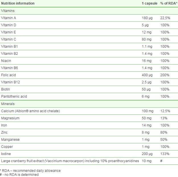 Vitaminokat, ásványi anyagokat, áfonyakivonatot és a nélkülözhetetlen folsavat tartalmazó étrend-kiegészítő.